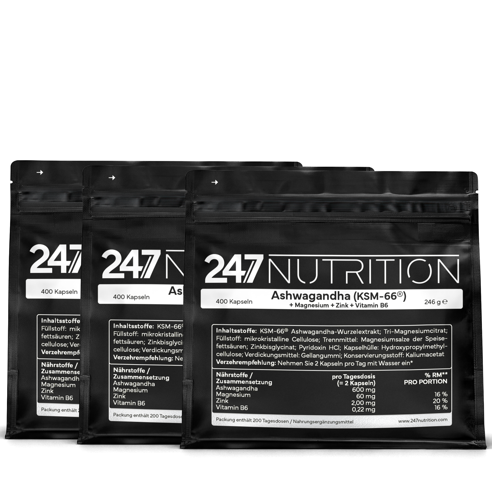 3x Ashwaganda + Magnesium + Zink + VitB6 - 400 Kapseln