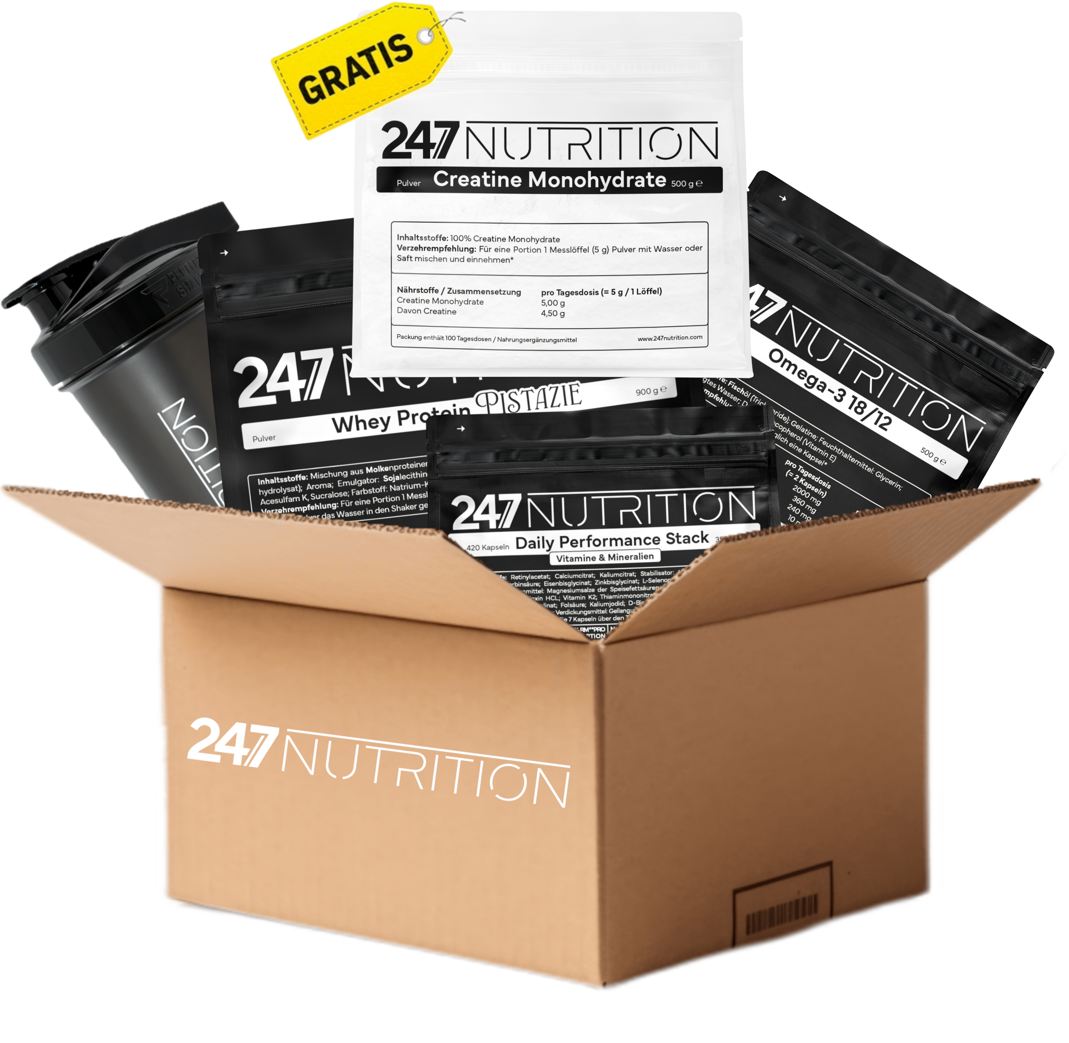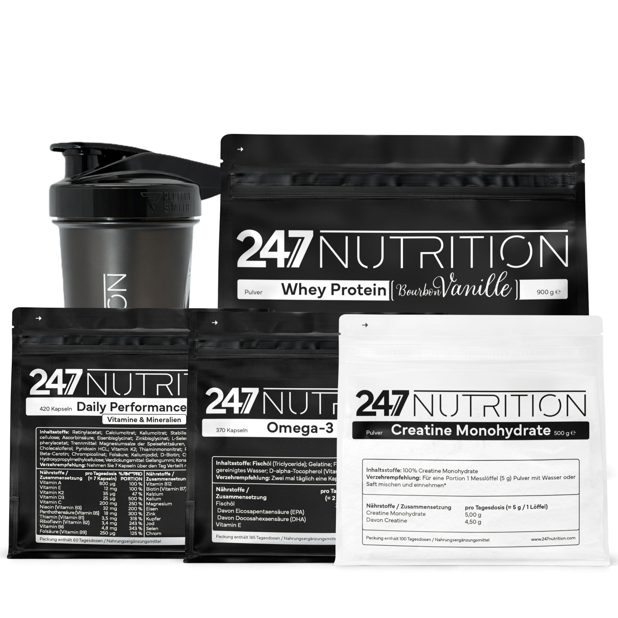 ✔ Hochwertiges Whey Protein für Muskelaufbau & Regeneration ✔ ultrafeines Creatine für intensive Trainingsphasen¹ ✔ Essenzielle Omega-3-Fettsäuren unterstützen Herz, Gehirn & Sehkraft bei regelmäßiger Einnahme ✔ Daily Performance Stack - hochwertiges Vitamin- und Mineralstoffpräparat für eine umfassende Versorgung ✔ Der praktische 247 Active Shaker
