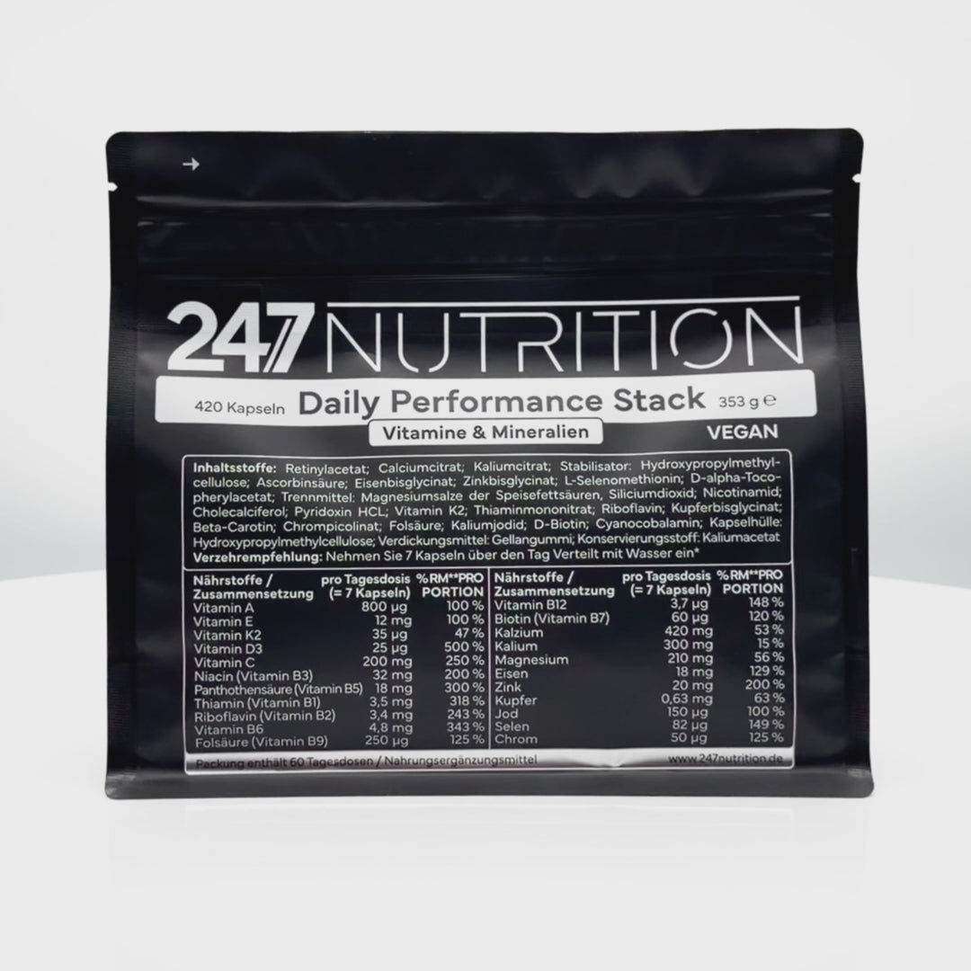 Umfassend versorgt - Der Daily Performance Stack enthält eine gezielte Kombination aus essenziellen Mikronährstoffen: darunter Vitamin A, C, D3, E, K2 sowie eine Auswahl wichtiger B-Vitamine. Ergänzt wird die Formel durch Mineralstoffe und Spurenelemente wie Calcium, Kalium, Magnesium, Eisen, Zink, Kupfer, Jod, Selen und Chrom – alle sorgfältig dosiert für die tägliche Versorgung.